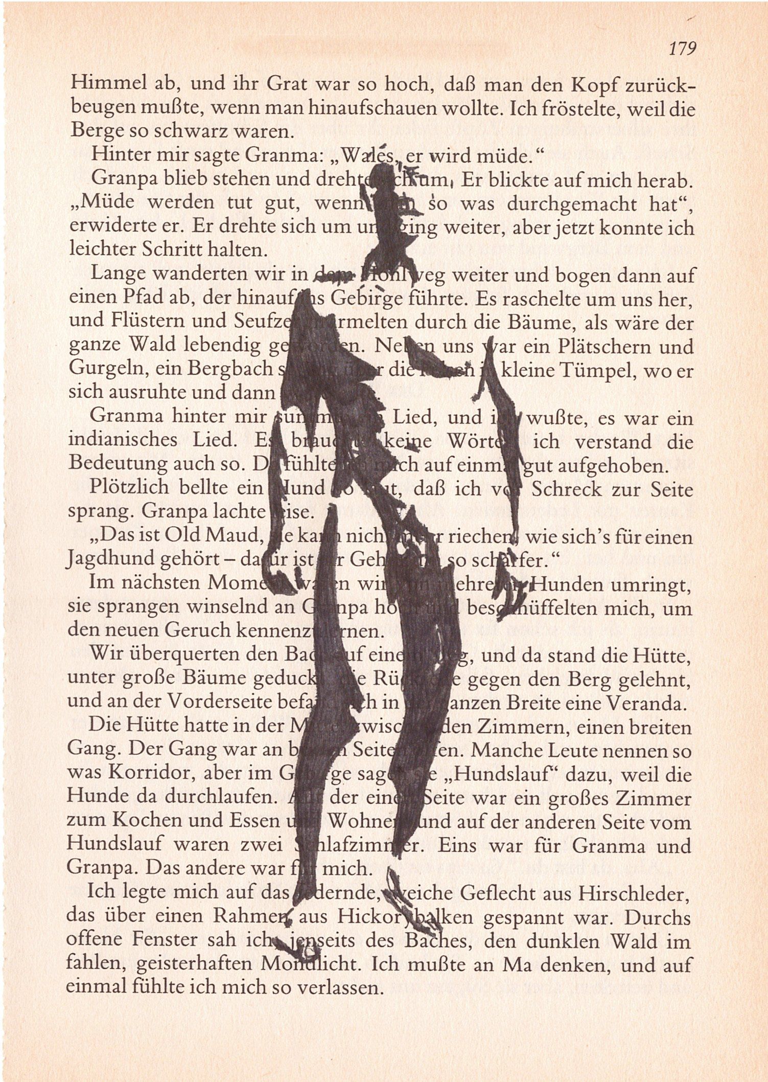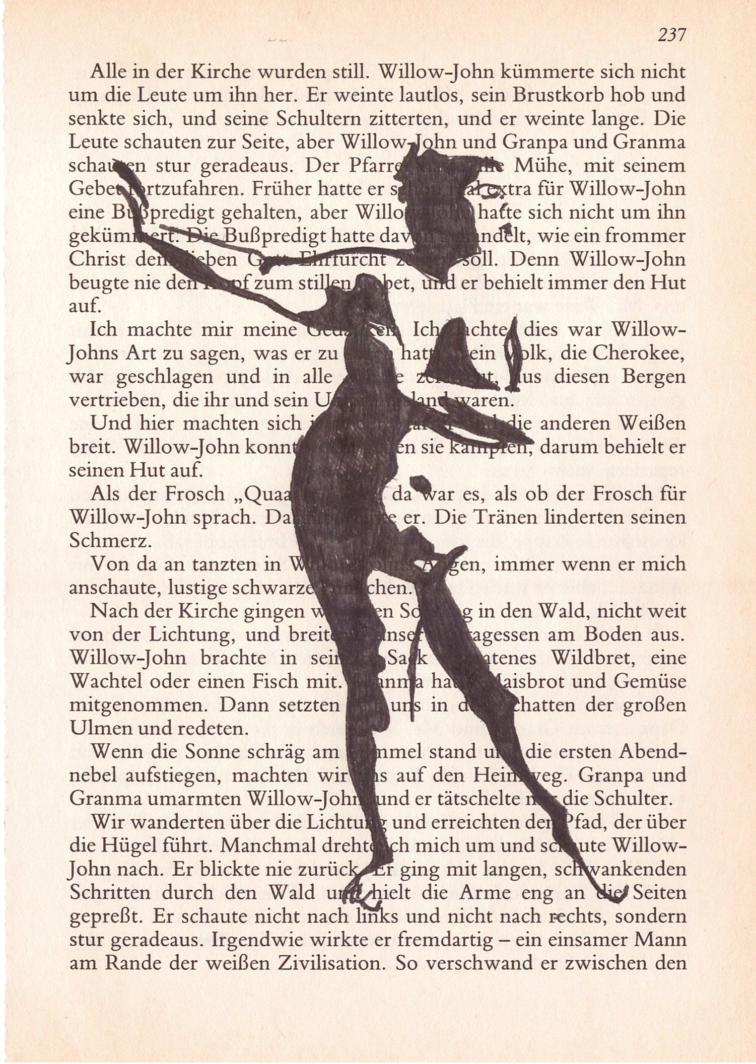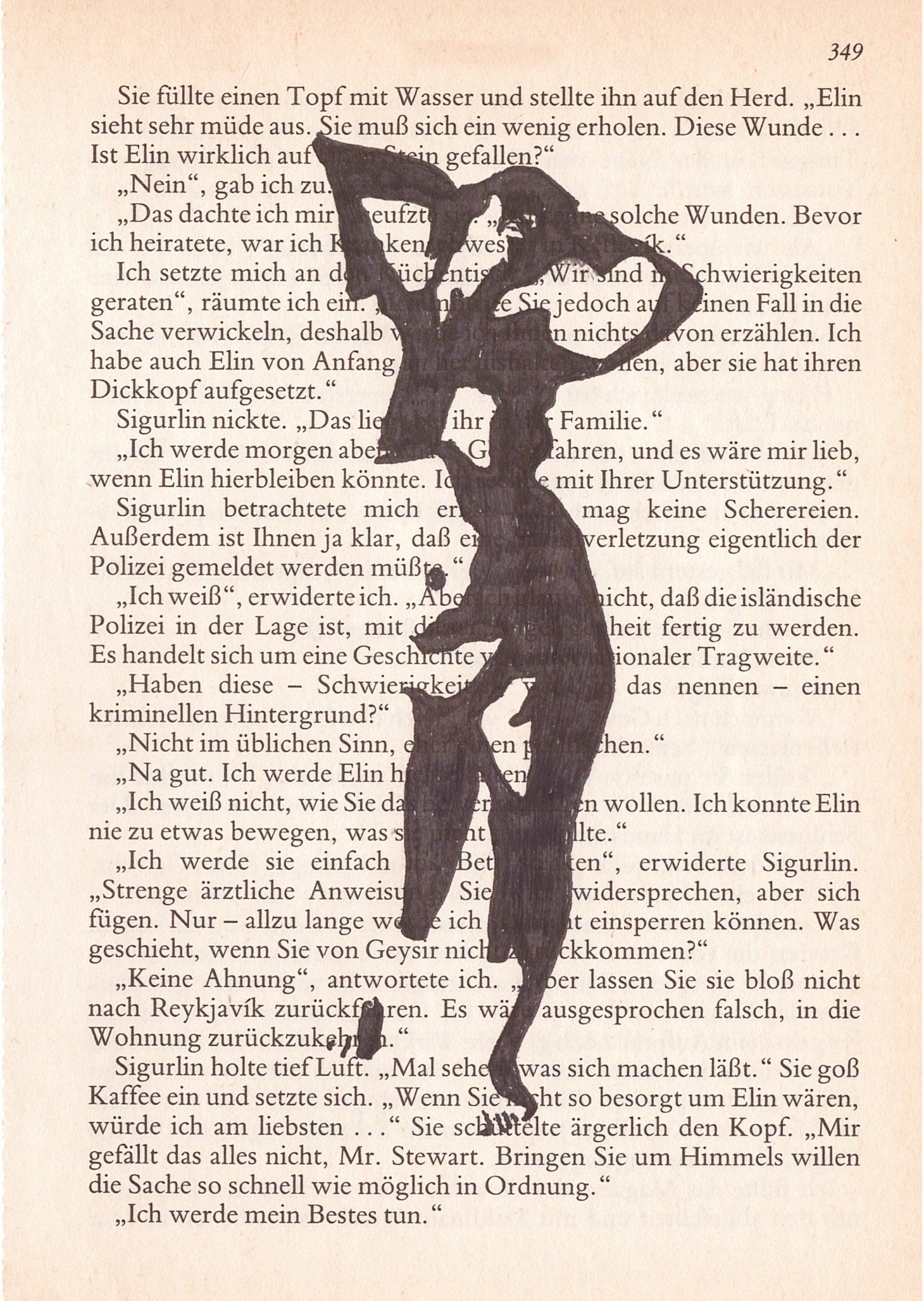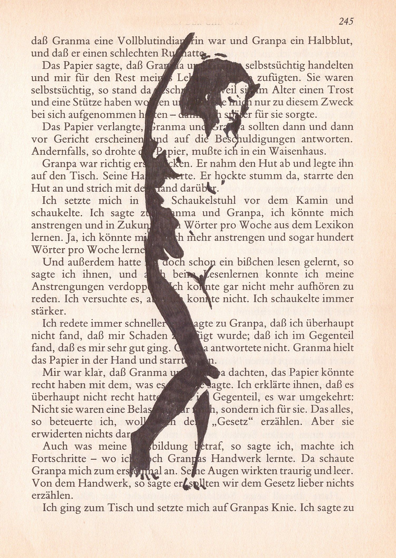 Hierzu zeichne ich mit Tusche auf alte Buchseiten.