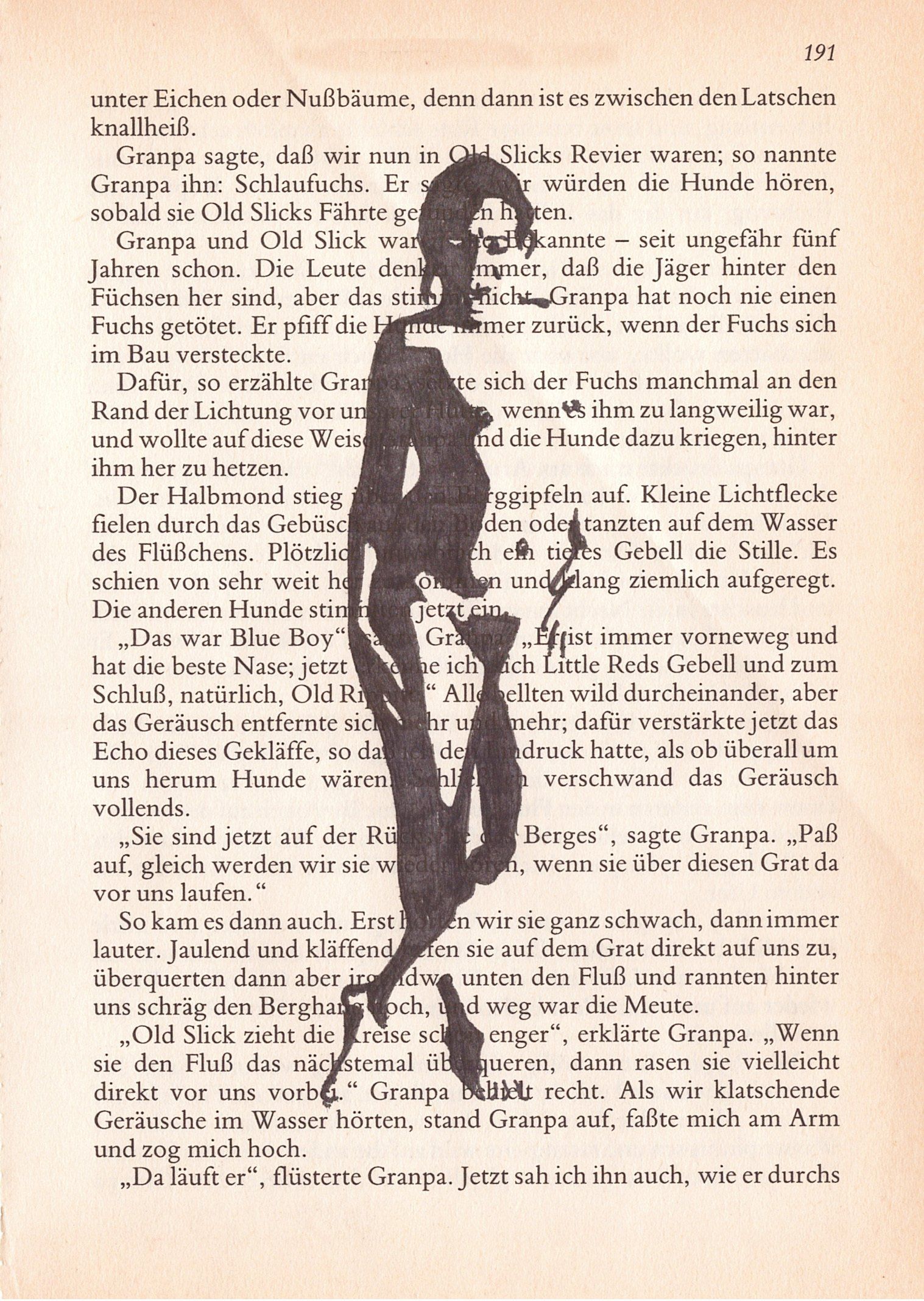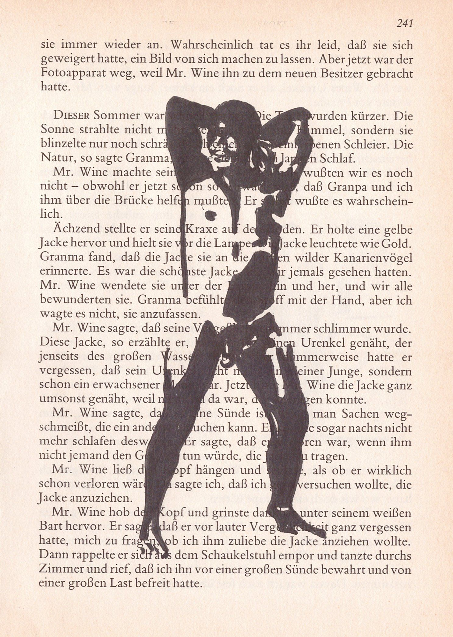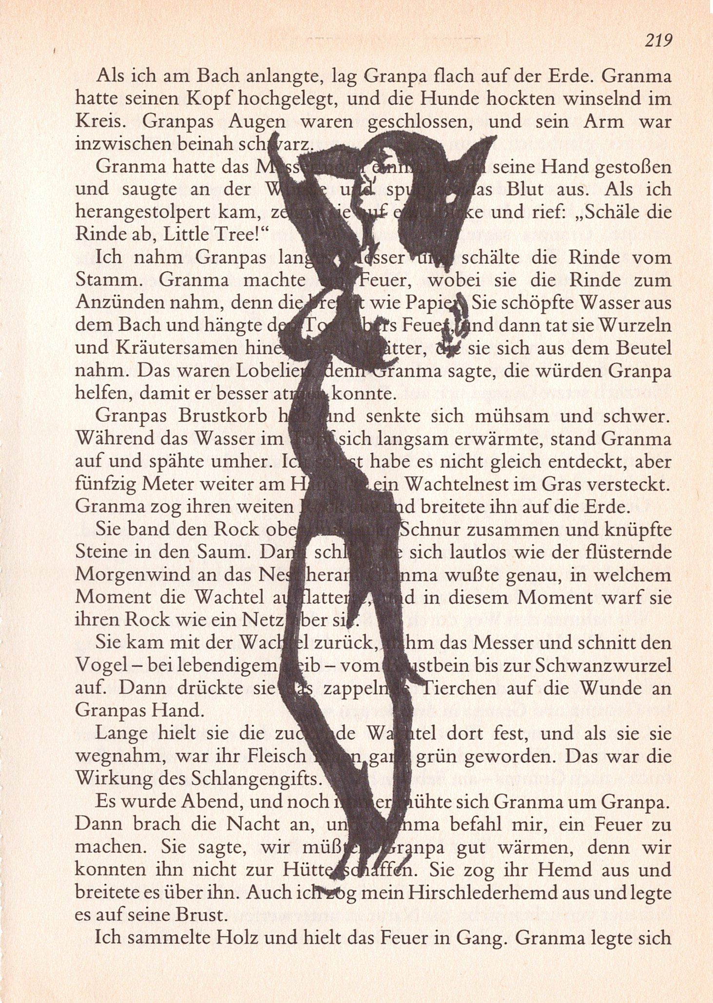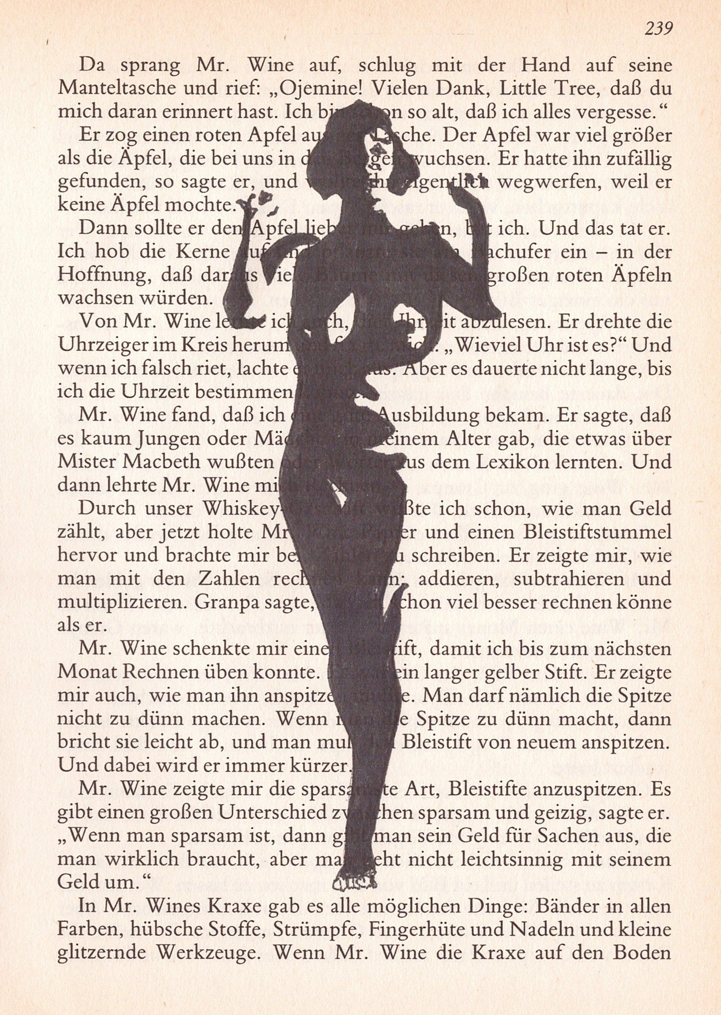 Hierzu zeichne ich mit Tusche auf alte Buchseiten.