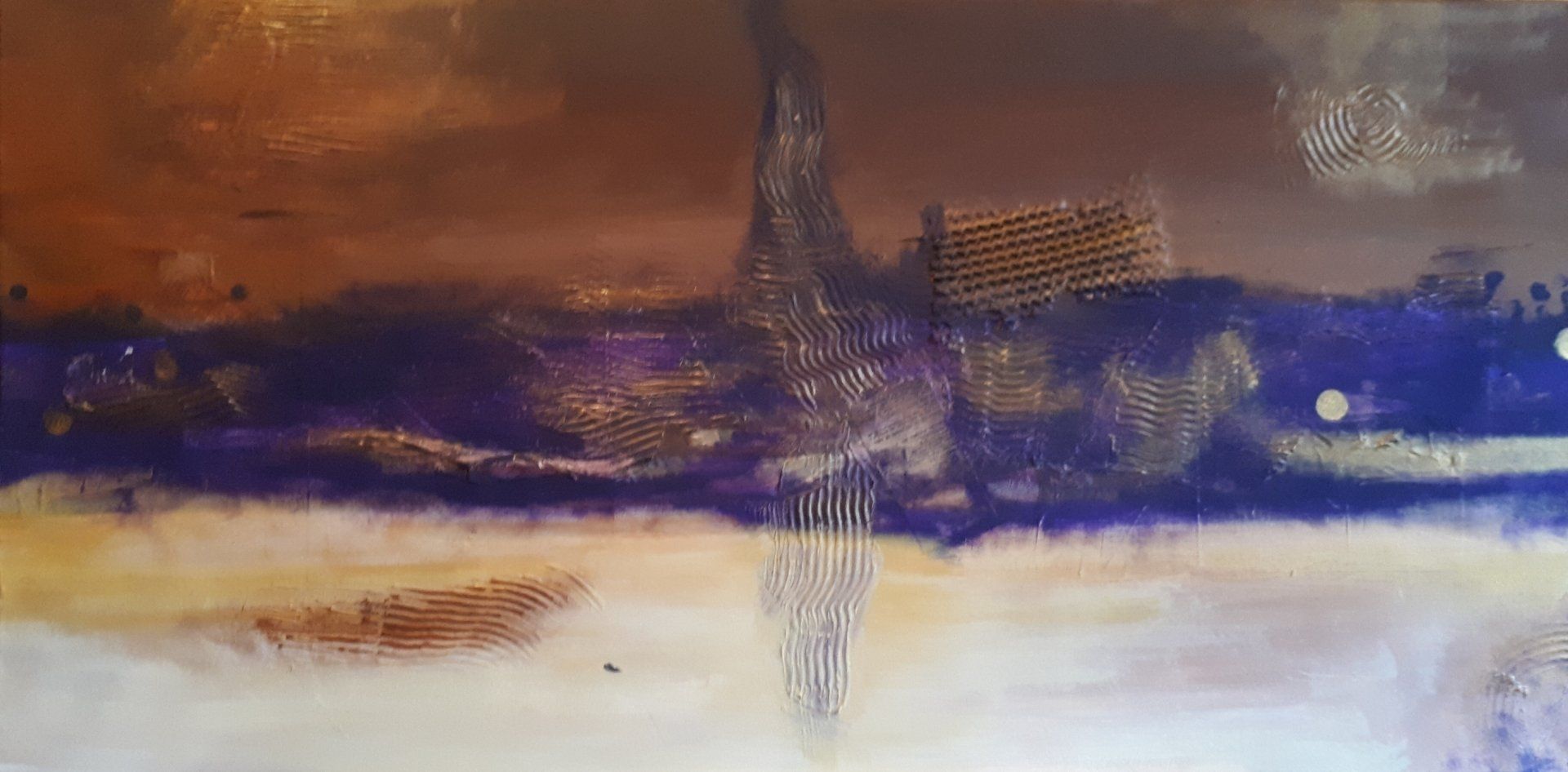 Sureale Landschaft, 100 x 50, Acryl, Wellpappe und Struktur auf Leinwand
