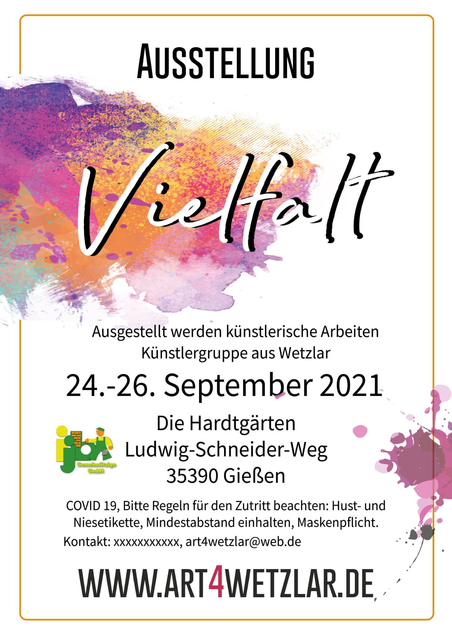 Am 25. und 26. September 2021 fand in der alten Industriehalle der Hardtgärten in Giessen die erste grosse Gruppenausstellung des Künstlerkollektivs Art4wetzlar statt. Als Mitglied der Gruppe durfte ich die Begrüssungsansprache halten und hatte dort die Möglichkeit eine Vielzahl meiner Arbeiten zu zeigen.